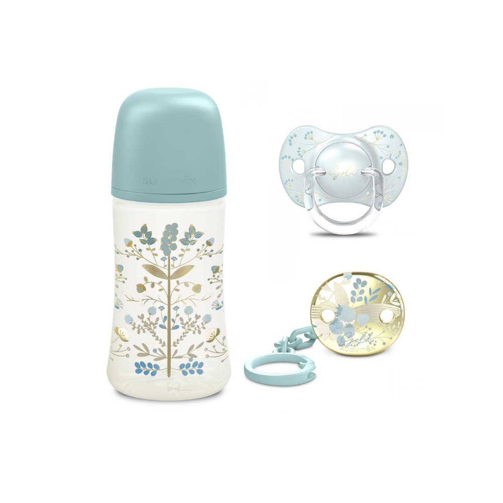 تم تصميم هذه المجموعة لتوفير التوليفة المثالية للأطفال، حيث تتضمن زجاجة رضاعة بحلمة سيليكون ذات تدفق متوسط (270 مل)، ولهاية مناسبة للأطفال من عمر 0-6 أشهر، ومشبك زينة لتثبيت اللهاية بأمان.